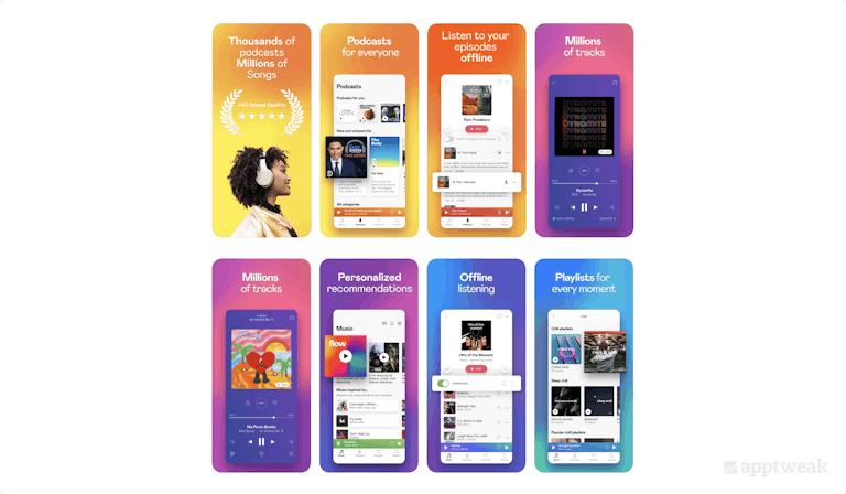 For example, Deezer has recently created both a custom product page (iOS) and a custom store listing (Google Play) with a new set of screenshots that rather showcase podcasts over music. With this custom product page, Deezer can then provide a tailored link directing people from a podcast-focused ad campaign to this more relevant product page. With this increased alignment between its offering and the expectations of its ad audience, the app can improve its conversion and lower cost per install (CPI).