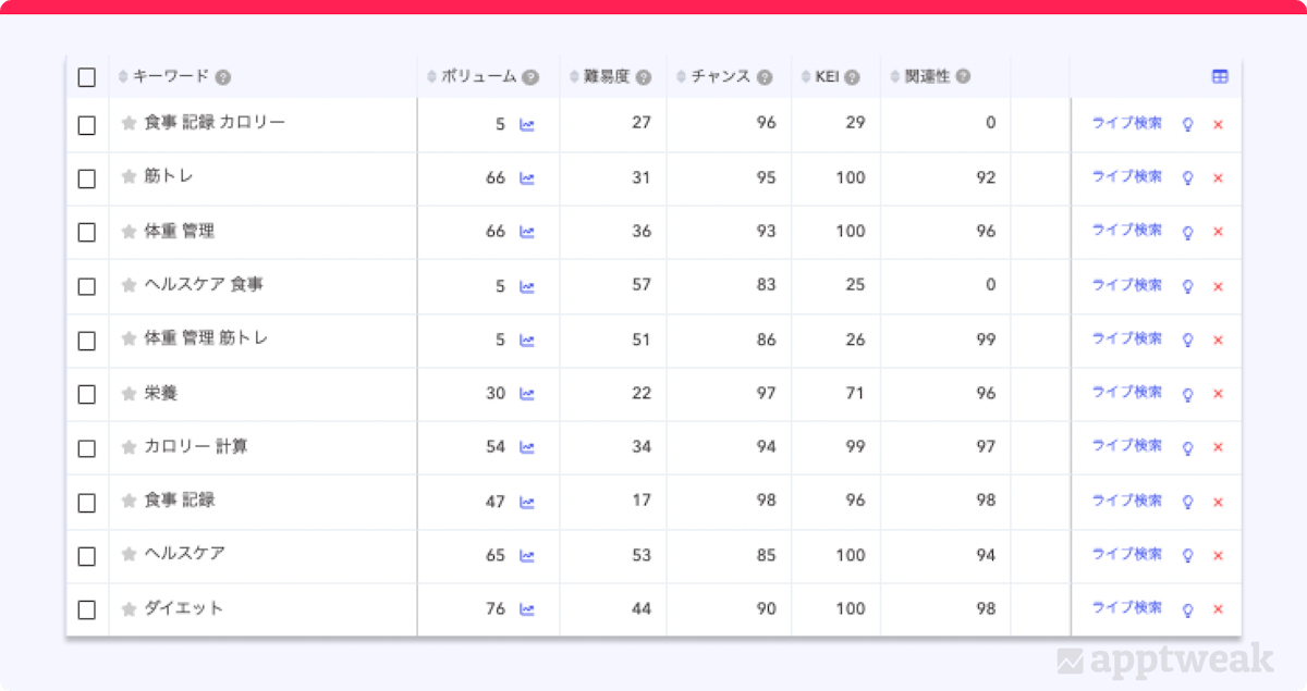 これらのAppTweakの重要な指標を活用して、アプリの説明文に最適なキーワードを選択してください。