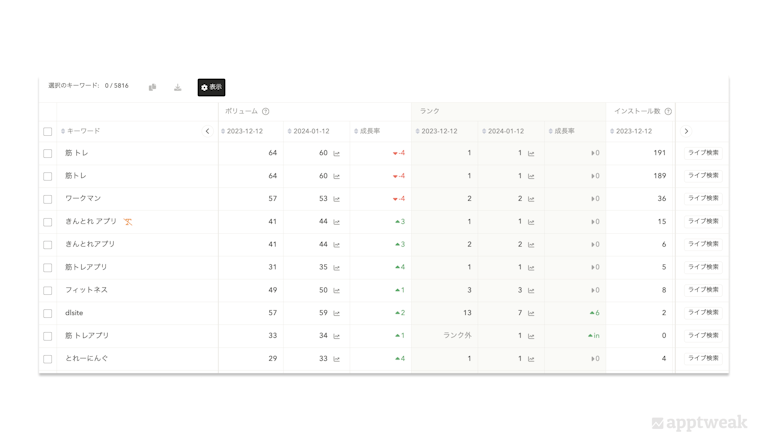 アプリのパフォーマンスが確認できたら、次はキーワード調査です。アプリストアでの可視性 (インプレッション数) を最大化するには、自社のアプリやサービスがアプリストアでどのようなキーワードで検索されているかを把握することが重要です。