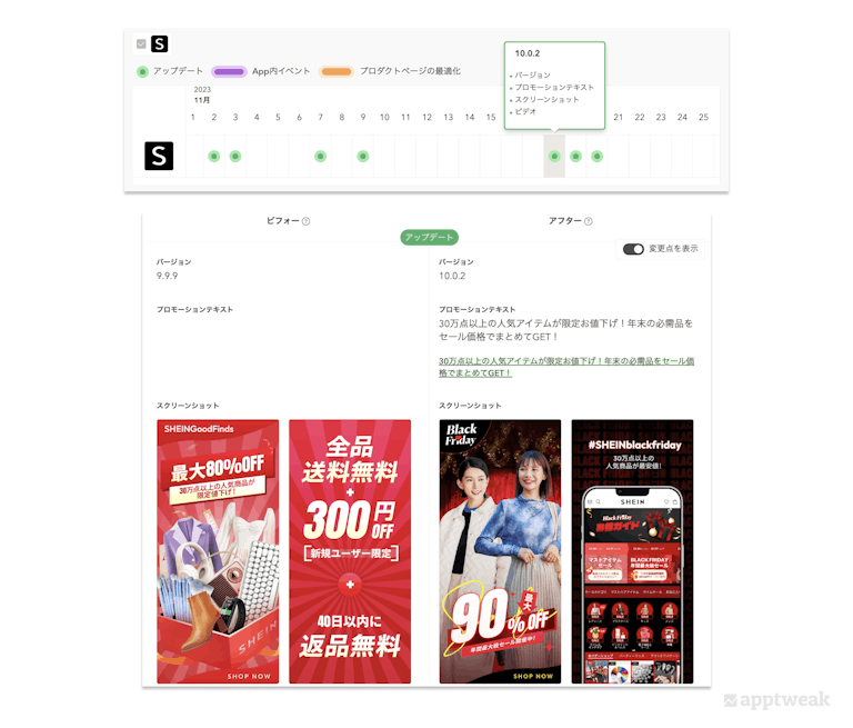 本来であれば、アプリストアで直接競合アプリを検索し、調査する必要がありますが、AppTweakのようなASOツールを活用することで、様々なアプリページを行き来することなく簡単に競合アプリのASOの状況を把握することができます。例えば、「ASOタイムライン」機能では、競合アプリがメタデータの更新を実施した具体的なタイミングや、変更点のビフォーアフターが確認できます。