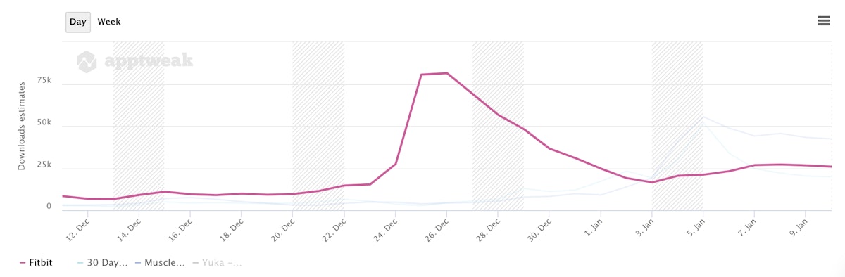 Health and fitness apps traditionally see downloads increase around Christmas and the start of the New Year. For instance, people are often gifted wearables, such as smartwatches, the use of which is maximized after downloading apps, hence the surge around the holiday season. At the beginning of the year, marketing for Health & Fitness apps focuses on healthy New Year’s resolutions.