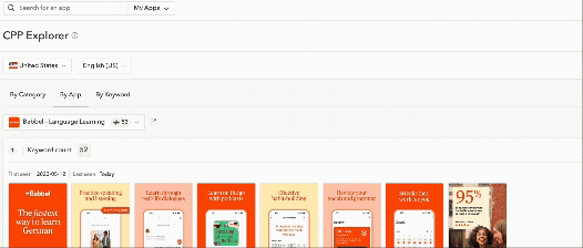 A popular way to do so is to re-use the successful custom product page as a template and adjust it to adjacent segments. This is something done efficiently by language learning app Babbel, which uses multiple variations of the same custom product page concept in Apple Ads, targeting search queries that follow the structure “learn [language name]”. While such strategy can seem quite evident, it has allowed Babbel to build not 1 but 14 different custom product pages and customize screenshots in search results for maximize relevancy.