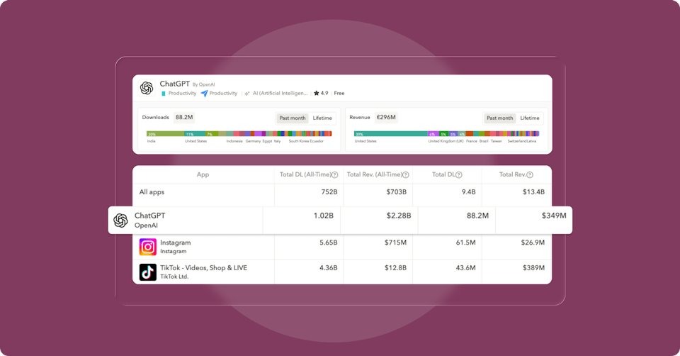 - App & Publisher Comparison: Benchmark downloads and revenue, track competitors over time, and compare performance by country, category, or store.
