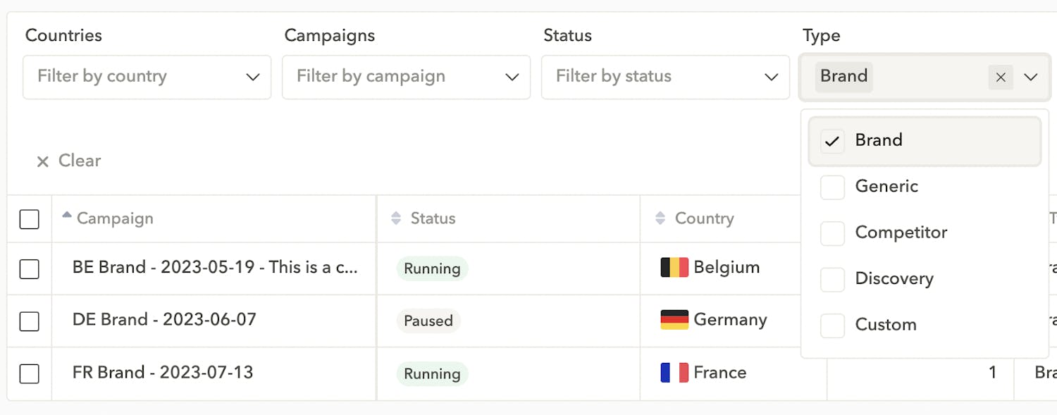 In Campaign Manager, use the “campaign type” filter to display one specific campaign type. Filter your view to quickly compare the performance of your brand campaigns for a given app across countries, for example.