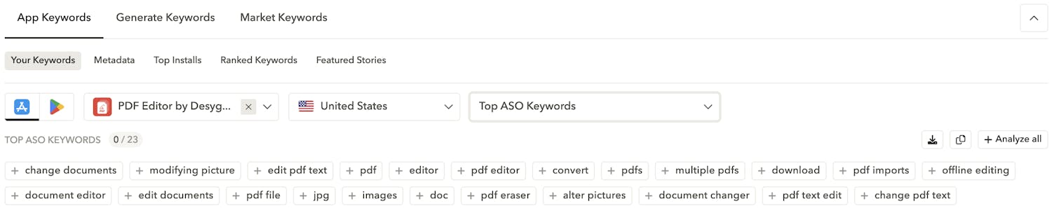 • App Store Keywords: Discover the keywords that are trending on the store, or the most relevant terms for a given category or AppDNA.