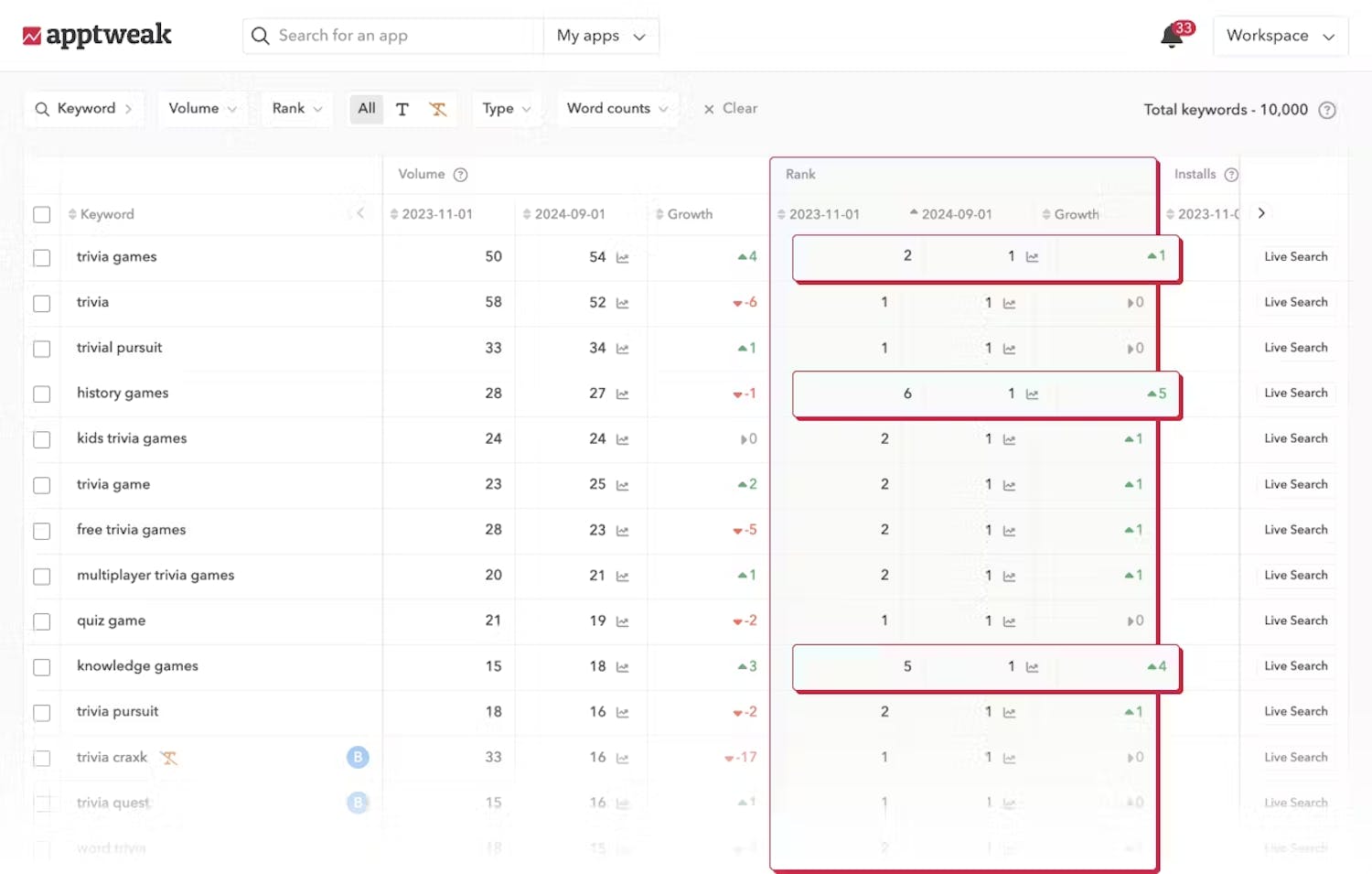 To improve your app's keyword rankings, start by auditing your current keyword performance. Get a complete picture of the keywords driving organic downloads to your app.