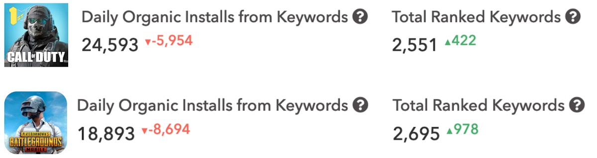 並べて比較すると、実際に両ゲームとも4月以降の数ヶ月間でキーワードからのオーガニックインストールを失っていることがわかります。ランクしているキーワードの総数は両ゲームとも増加していますが、キーワードベースの日次オーガニックインストール数は、Call of Duty®: Mobileで2,766、PUBG MOBILEで2,750減少しています。 これはどういう意味なのでしょうか?