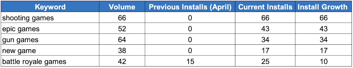 では、メタデータの更新以降、これらのゲームはどのキーワードでランキングとダウンロードを獲得したのでしょうか?両ゲームとも「epic games」、「battle royale」、「new game」、「gun games」などのジャンル固有のキーワードでランクを上げています。Call of Duty®のトップ成長キーワードがより重要なのは、4月に行ったサブタイトルの更新に「battle royale」と「sniper」の両方が含まれていたためです。