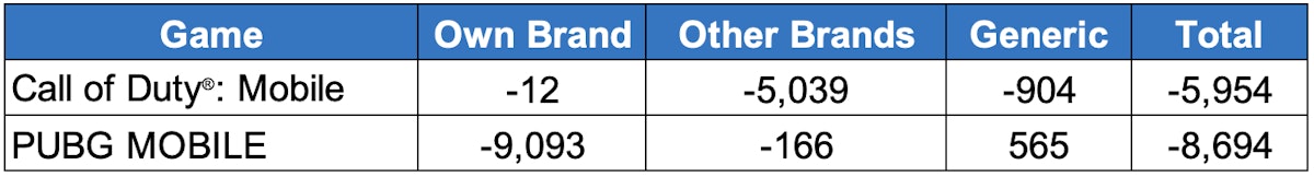 今年のパンデミックは広範な影響を及ぼし、モバイルゲームのダウンロードは3月から5月にかけて確かに急増しました。しかし、ユーザーのゲーム検索方法が変化しています。例えば、これらの特定のゲームについて、次のことに気付きました:「ブランド」キーワードからのインストールは各ゲームで(異なる程度で)減少していますが、「一般」キーワードからの日次インストールは実際にPUBG MOBILEで564増加し、Call of Duty®: Mobileでは減少しています。