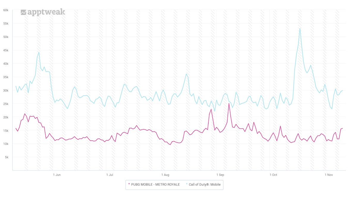 AppTweakの両ゲームの日次ダウンロード推定数を見ると、各アプリは毎日数千のダウンロードを簡単に獲得していることがわかります。PUBG MOBILEは毎日10,000から20,000のダウンロードを獲得していますが、Call of Duty®は通常25,000から35,000を獲得し、時には50,000を超えることもあります!このような素晴らしいダウンロード数と全体的な権威により、Call of Duty®がこのラウンドに勝利します。