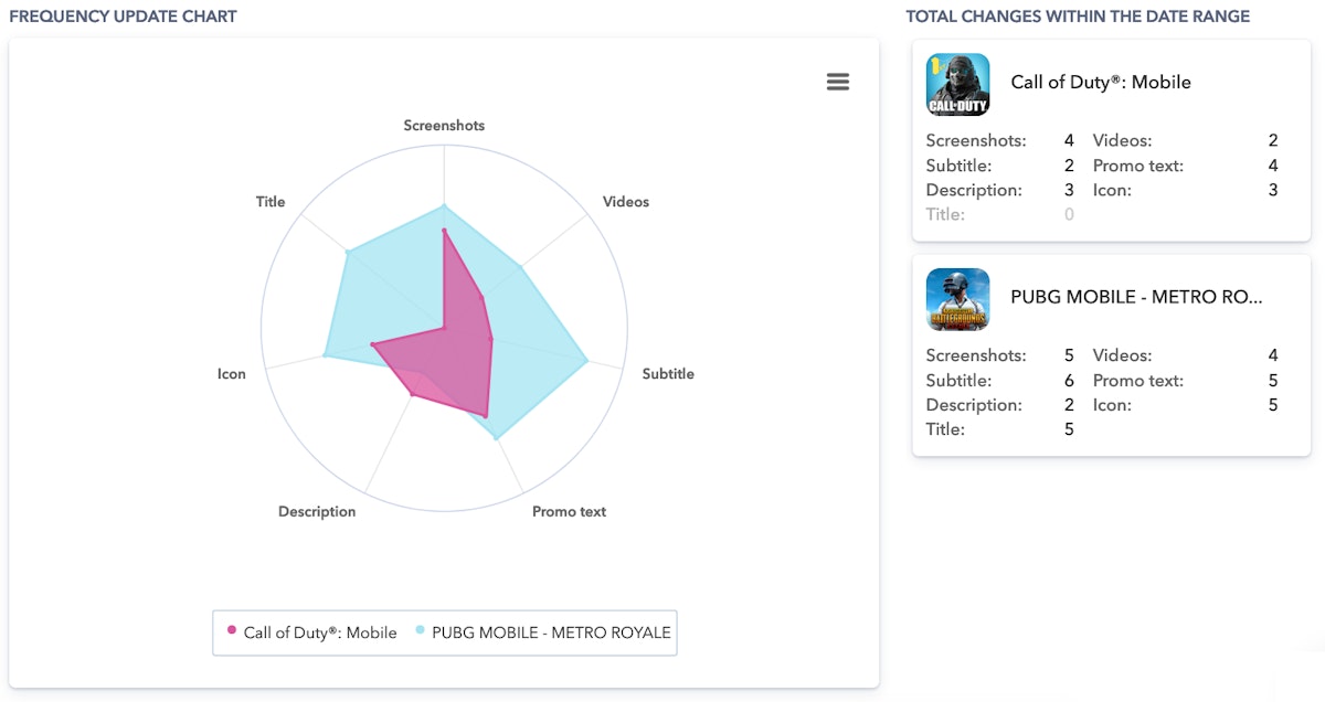 Call of Duty®はスクリーンショット、プロモーションテキスト、フィーチャービデオ、サブタイトル、説明文、アイコンを更新しましたが、最近タイトルは変更していません。PUBG MOBILEはこれらの各領域を少なくとも2回は更新しています。