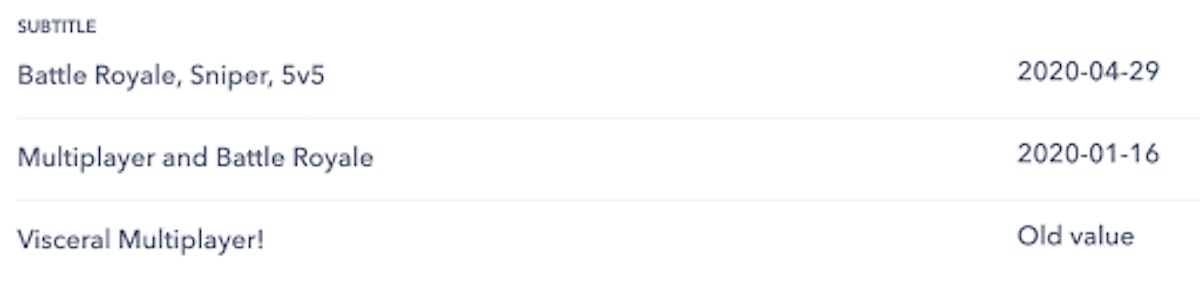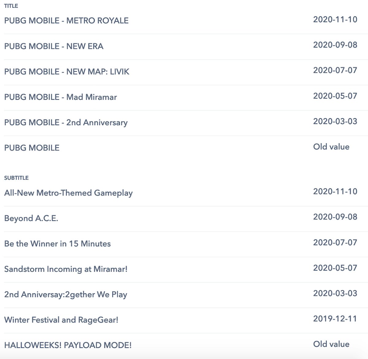 実装されたメタデータには、タイトルとサブタイトルにわたって新しいキーワードのセットが含まれています:「metro」、「royale」、「all-new」、「themed」と「gameplay」です。過去1年間で、PUBG MOBILEはタイトルを5回、サブタイトルを6回変更しており、この重要なスペースにどのキーワードを入れるべきか積極的に検討していることがわかります。