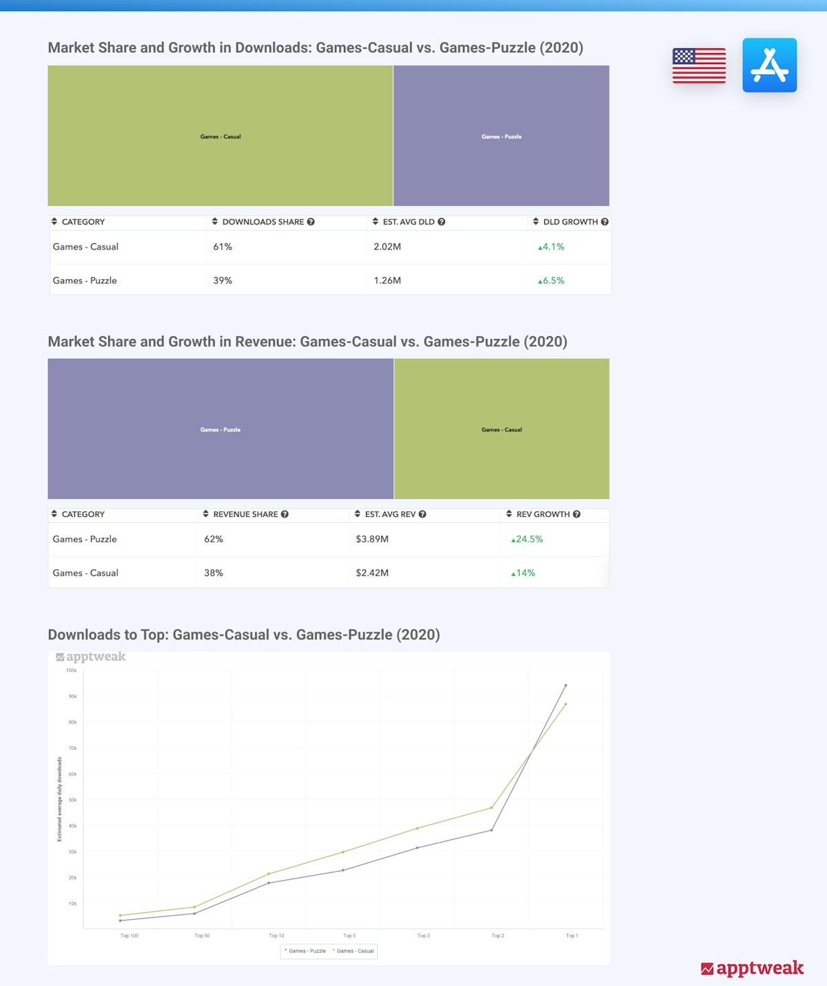 新しいマッチ3パズルゲームの場合、主なカテゴリとしてGames-PuzzleカテゴリとGames-Casualカテゴリのどちらを選ぶかを決めたいとしましょう。以下に示すように、米国のMarket Intelligenceでは、Games-Puzzleカテゴリは2020年を通じてダウンロード数と収益に関してGames-Casualカテゴリよりも高い成長を遂げました。しかし、ダウンロード数の合計はGames-Casualカテゴリの方がはるかに多かったです。