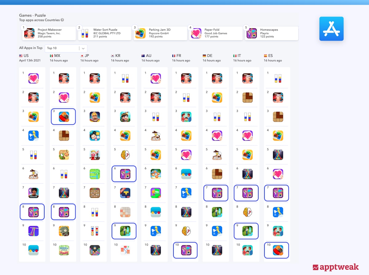 以下の例では、App StoreのGames-Puzzleカテゴリで9つの市場にわたるトップ10のゲームを見ています。マッチ3パズルゲーム、例えばHomescapesやGardenscapesは、スペイン、イタリア、メキシコで非常に人気がありますが、日本やオーストラリアではあまり人気がありません。
