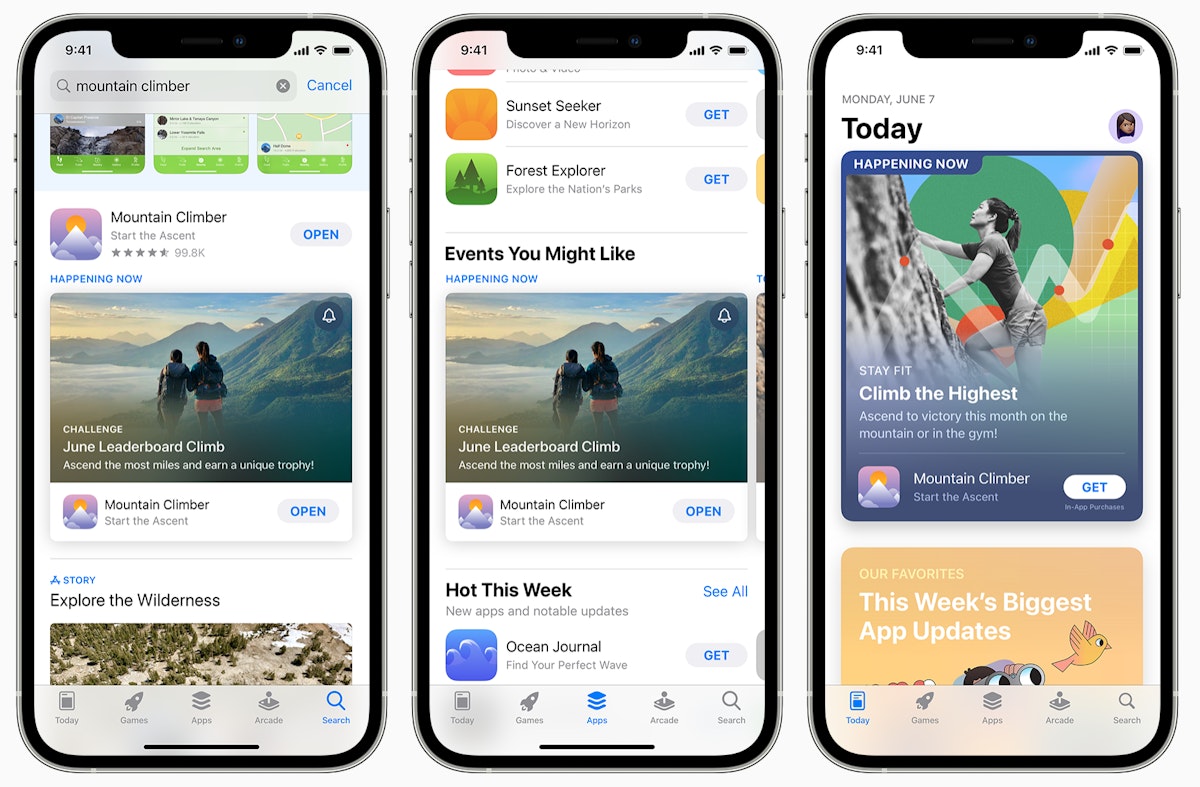 可視性の点では、Appleは、イベントカードが、アプリをすでにインストールしているユーザーの製品ページではスクリーンショットの上に、それ以外のユーザーでは下に表示されることを確認しました。また、検索結果では、すでにインストールしているアプリを検索するユーザーに対してはイベントカードがスクリーンショットに代わって表示されます(まだインストールしていないユーザーは通常のスクリーンショットまたはアプリプレビューを引き続き見ることができます)。ユーザーがイベント自体を検索すると、イベントカードはアプリに加えて表示されます。最後に、Appleはイベントカードを、今日のタブ、アプリタブ、ゲームタブの両方で、編集上の特集の一部として表示します。パーソナライズされた特集も、これら最後の2つのタブでイベントを表示し、イベントのアクティブユーザー、休眠ユーザー、または新規ユーザーへのターゲティングに基づいて表示される可能性が高いです。