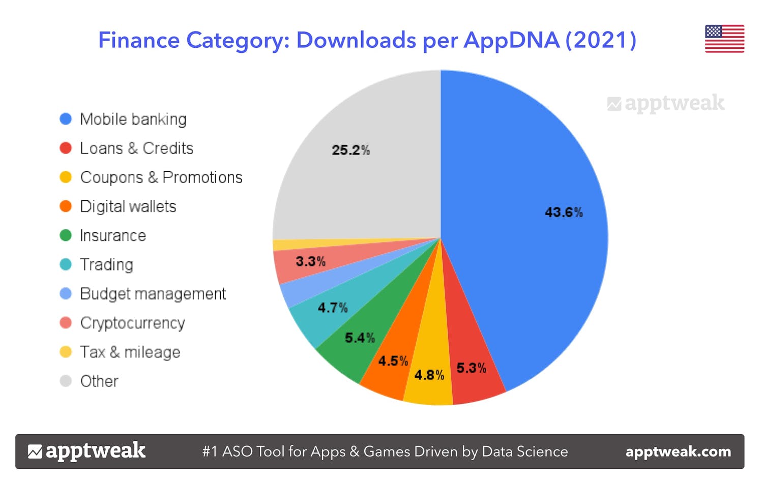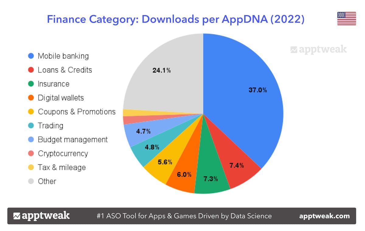 トレーディングアプリは新型コロナウイルスのパンデミック中に利用が急増しました。しかし、ファイナンスカテゴリ全体を見ると、トレーディングアプリはダウンロード数のごく一部を占めるに過ぎません。ファイナンスカテゴリ内では、モバイルバンキングアプリが全ダウンロード数の37.0%を占める最もダウンロード数の多いアプリです!