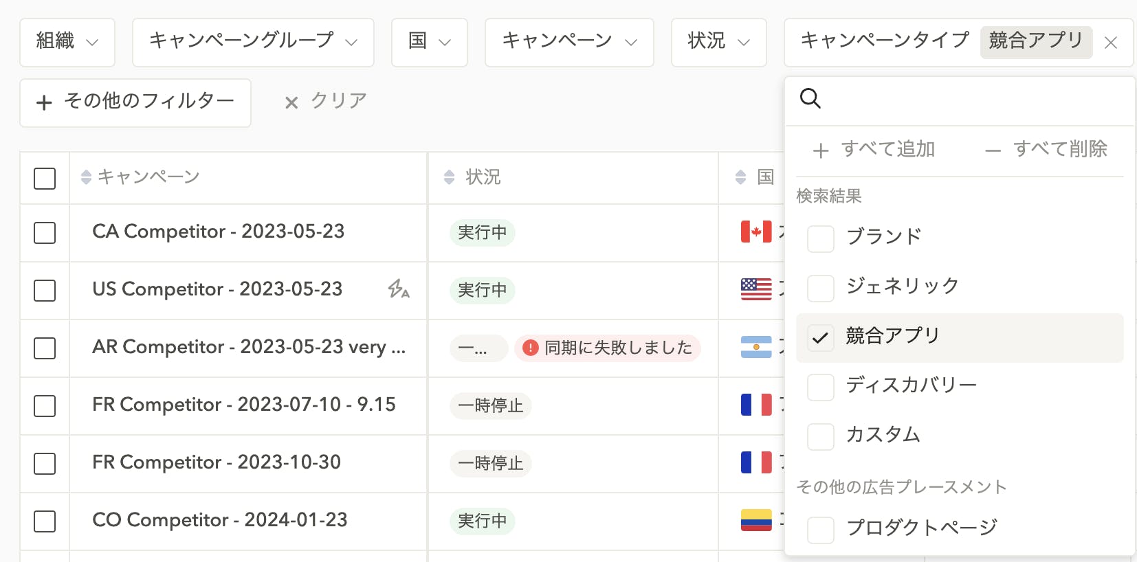Search Ads Managerでは、「キャンペーンタイプ」フィルターを使用して特定のキャンペーンタイプのみを表示することができます。例えば、ブランドキャンペーンのパフォーマンスを国ごとに比較したい場合などに、フィルターを活用すると良いでしょう。