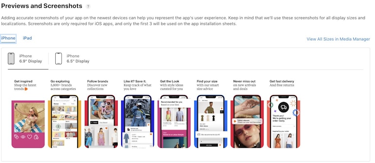 App Store Connect는 앱 개발자가 단 하나의 iPhone 크기(이제 6.9인치 스크린샷이 이전 6.7인치 스크린샷을 대체하며, 5.5인치 스크린샷은 더 이상 필요하지 않습니다)와 하나의 iPad 크기에 대해 스크린샷을 업로드할 수 있도록 허용합니다.