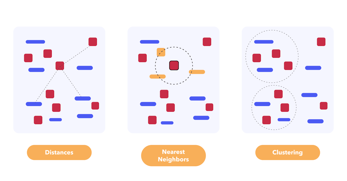 - 중간에는 위에서 설명한 3가지 서비스가 있습니다. 이 서비스들은 이러한 수학적 형식주의를 거리, 최근접 이웃, 클러스터와 같은 구체적인 정보로 변환합니다. 이는 라자냐 파스타와 같아서 소스의 미묘함이 충분히 느껴져 한 입 베어 물고 싶게 만듭니다.