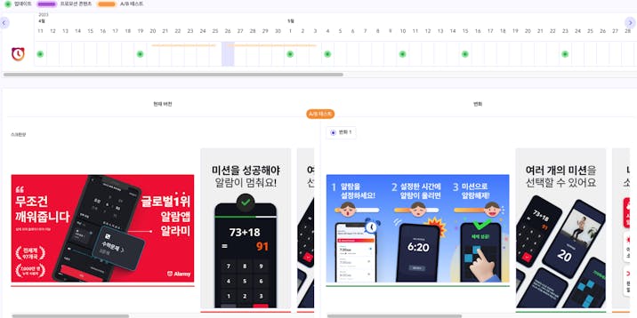 알라미의 메타데이터 업데이트 타임라인을 보면, 약 14일간 A/B 테스트를 진행한 직후 그 결과를 바탕으로 스크린샷을 변경한 것을 알 수 있습니다.