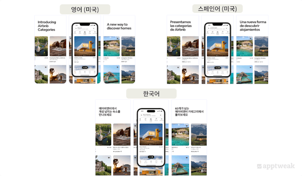 글로벌 서비스를 제공하는 에어비앤비는 각 시장에 맞게 스크린샷의 텍스트 언어를 변경하고 있음을 아래 예시를 통해 알 수 있습니다. 일본 시장에는 일본어 카피를 사용하고 있으며, 미국 시장에서는 영어뿐만 아니라 스페인어를 사용하는 사용자들을 위해 현지화 작업을 하고 있습니다.