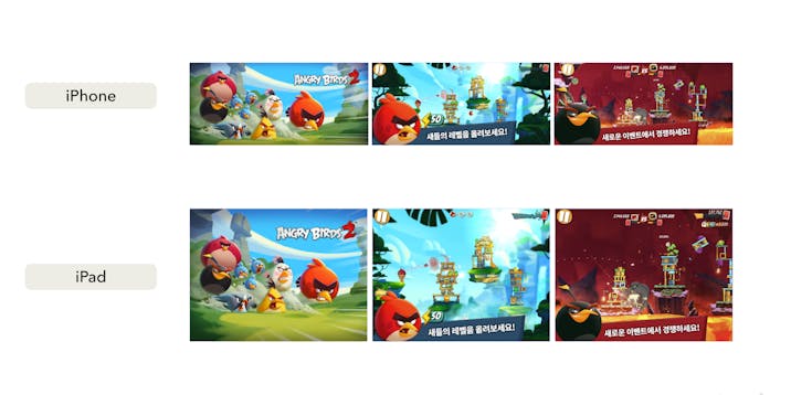 위의 Angry Birds의 스크린샷과 같이 아이폰과 아이패드에서 같은 이미지를 사용하더라도 각각에 맞는 크기를 설정하면 높은 화질을 유지하면서 표시할 수 있습니다.