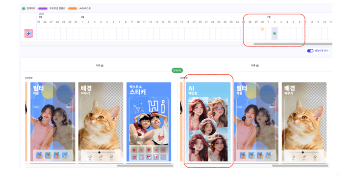 경쟁 앱 조사를 할 때 AppTweak의 ‘타임라인’ 기능을 활용하면 경쟁사가 언제 메타데이터를 변경했는지 비포앤애프터(Before & After)를 쉽게 확인할 수 있습니다.