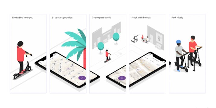예를 들어, 아래 전동스쿠터 공유 앱 버드(Bird)의 예시를 보면 스쿠터를 빌리는 것부터 반납하는 것까지의 과정을 스크린샷으로 보여주고 있음을 알 수 있습니다. 이처럼 하나의 큰 이미지를 분할해서 보여주는 것도 사용자의 관심을 끌고 전환율을 높이는 데 효과적입니다.