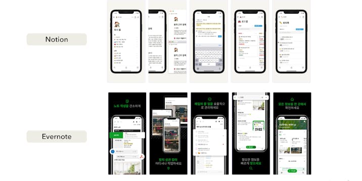 Notion 및 Evernote의 스크린샷 예시 (App Store, 대한민국)