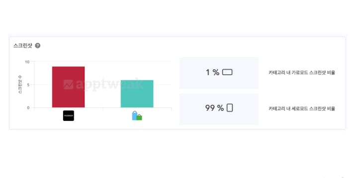 AppTweak의 메타데이터 벤치마크 또는 업데이트 기록 기능을 사용하면 같은 카테고리에 속하는 앱 또는 경쟁 앱의 스크린샷 업데이트 빈도수 그리고 방향성을 파악하실 수 있습니다. 예를 들어, 쇼핑 앱 (무신사)는 9장의 스크린샷으로 같은 쇼핑 카테고리 앱의 평균 스크린샷 수 (6장)보다 더 많은 스크린샷을 사용하고 있음을 알 수 있습니다. 또한, 쇼핑 카테고리의 스크린샷 방향의 경향은 세로 방향이 99%로 대부분을 차지하고 있음을 알 수 있습니다.