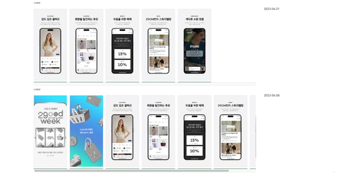 이 추세에 따라갈 것인지, 아니면 경쟁 앱과의 차별화를 위해 가로모드 스크린샷 등과 같은 다른 방법을 시도해볼지는 여러분의 결정에 달려있습니다. 만약 같은 카테고리 내 경쟁 앱의 스크린샷 업데이트 주기성 또는 방향성을 확인해보고 싶다면 AppTweak의 메타데이터 기록을 확인하시면 됩니다. 위의 예시 쇼핑 앱 29CM처럼 정확히 언제 어떤 스크린샷을 업데이트했는지 눈으로 직접 확인하고 우리 앱의 개선 및 반영할 부분들을 고안하실 수 있습니다.