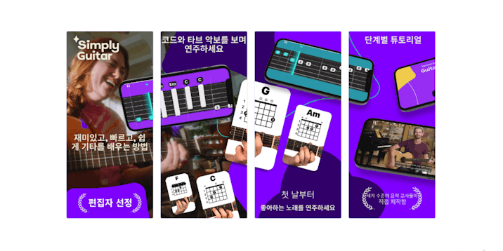 Simply Guitar의 스크린샷 예시를 보면, 앱을 사용하는 사람의 이미지를 삽입해 앱의 실용성을 쉽게 전달하고 있습니다.