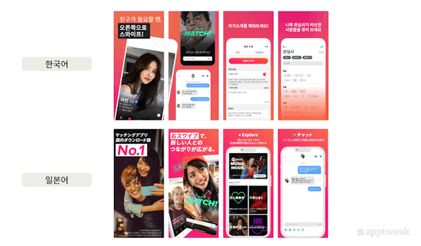 위 그림에서 볼 수 있듯이 Tinder의 스크린샷은 텍스트뿐만 아니라 앱 화면 캡쳐도 각 국가별 시장(한국, 일본)에 맞게 현지화되어 있습니다. 특히 데이트 앱과 같이 사용자 간의 교류가 있는 경우, 안심감과 친밀감이 전환율 향상으로 이어지기 때문에 최대한 현지화할 필요가 있습니다.