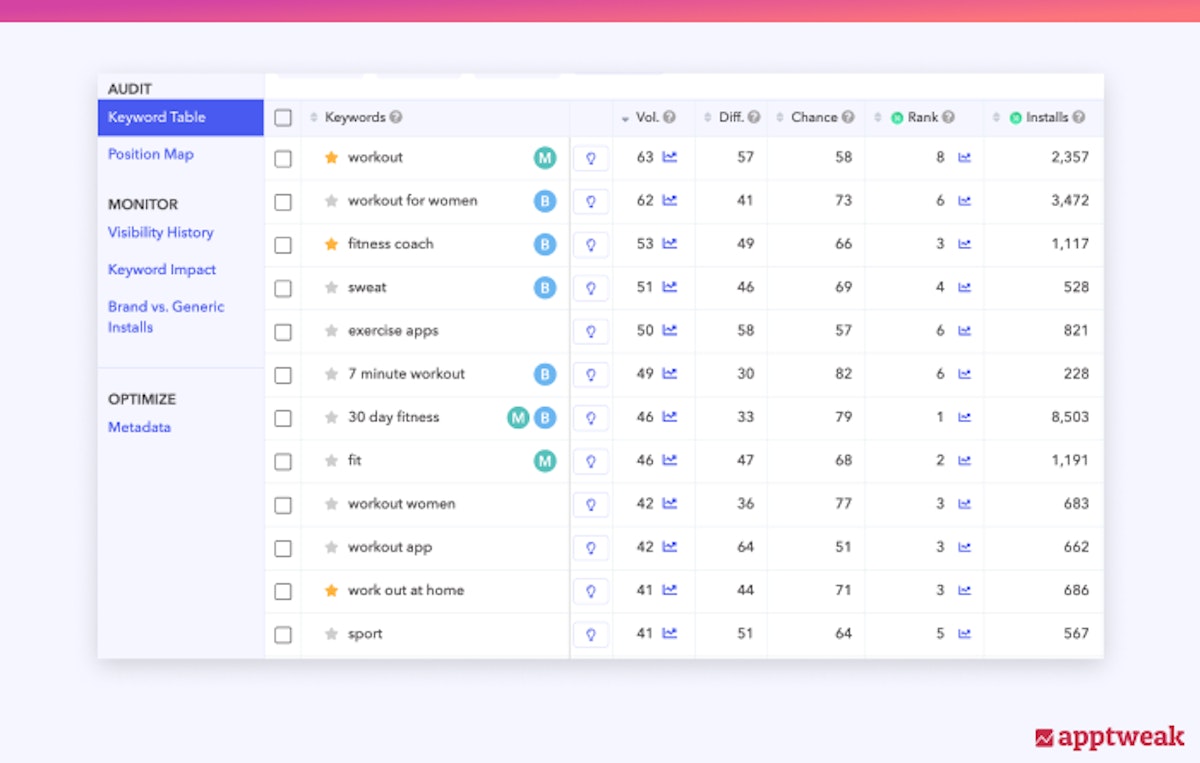 AppTweak 키워드 도구 스크린샷: 키워드 볼륨, 기회 점수, 키워드 순위, 설치 수(키워드가 앱으로 유도하는 예상 유기적 설치 수)와 같은 지표를 보여줍니다.