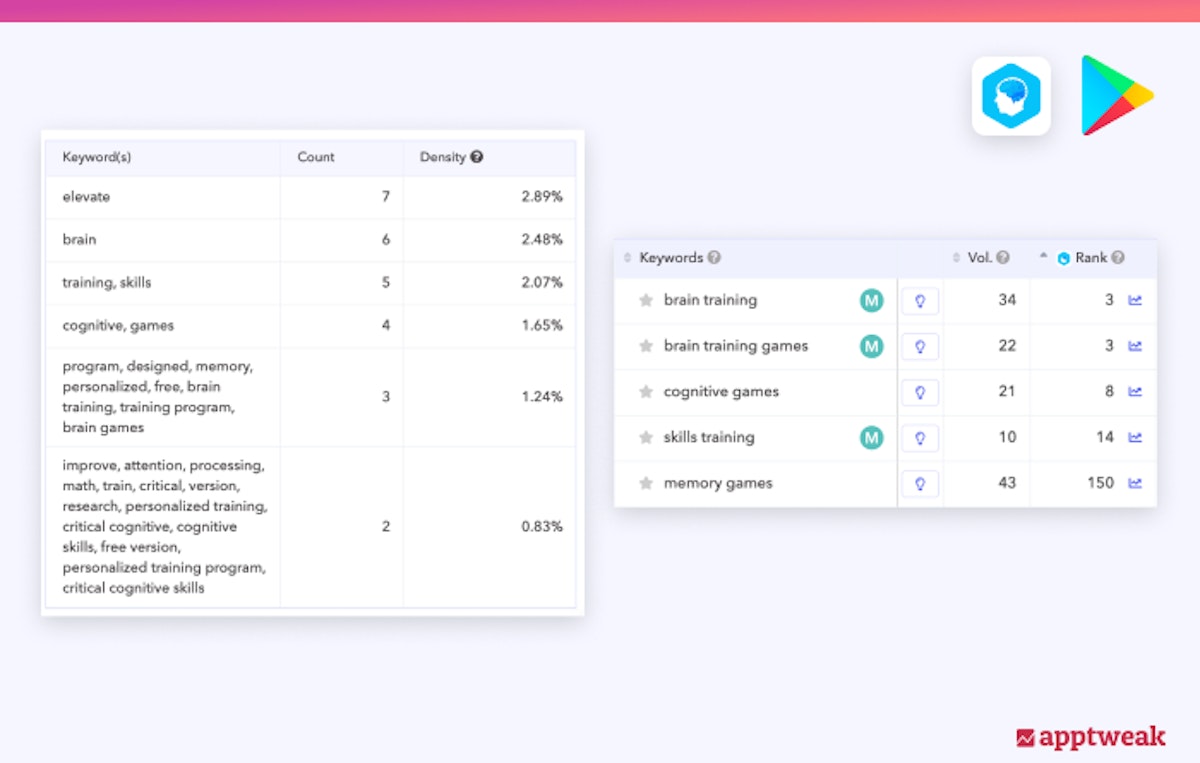예를 들어, Elevate는 긴 설명에서 “memory”보다 “cognitive”에 대한 밀도가 더 높습니다. 그 결과, 해당 앱은 “memory games”보다 “cognitive games”에서 더 높은 순위를 차지합니다.
