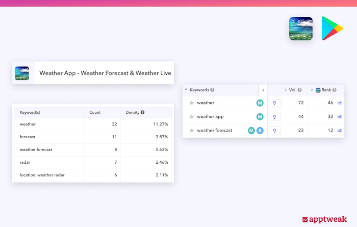 Weather Fantasy의 Weather App은 제목에 “weather” 키워드를 3번, 부제목에 3번, 긴 설명에 32번 반복합니다. 심지어 개발자 이름에도 키워드를 추가했습니다. 그럼에도 불구하고, 이 앱은 “weather” 키워드에 대해 상위 20위 안에 들지 못합니다. 오히려 이와 같은 키워드 스터핑된 메타데이터는 사용자에게 이 앱이 고품질 앱이 아니라는 신호를 줍니다.