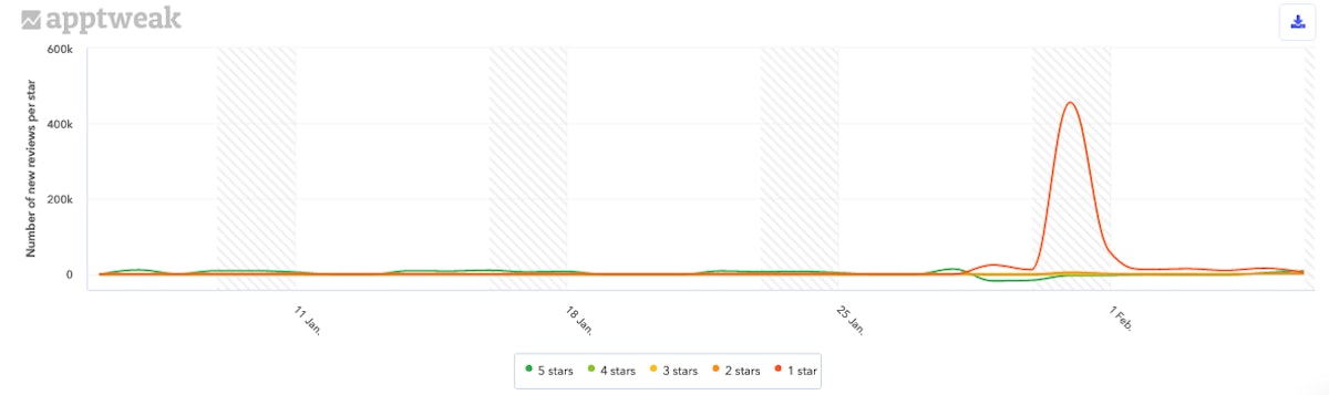 1월 말에 앱이 45만 개 이상의 부정적인 리뷰를 받았음에도 불구하고, 이미 보유하고 있던 매우 높은 긍정적인 평점 덕분에 앱은 평균 4점 이상의 평점을 유지할 수 있었습니다. 평점은 하루 만에 4.72에서 4.13으로 떨어졌고 점차 계속 감소하고 있지만, 이는 Google Play 앱이 겪고 있는 상황보다는 훨씬 덜 심각합니다.