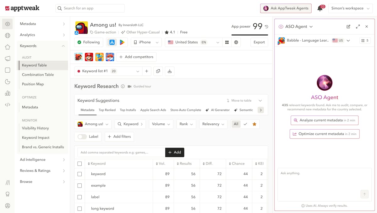 12+ Keyword Research ToolsWe have a database of over 30 million keywords in 100+ countries. Effortlessly create keyword lists relevant to your app and category. Translate all keyword suggestions into any language to make localization easier.